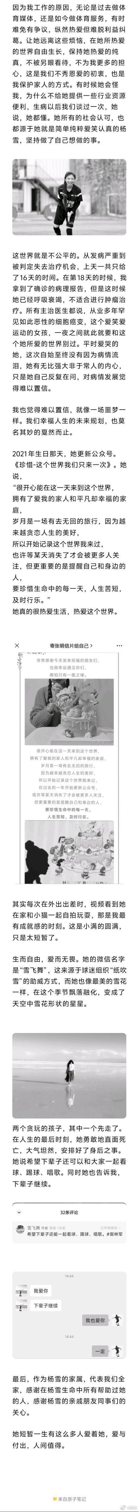 在生命的最后时刻,杨雪自始至终非常勇敢坚强,在呼吸机的支持下,观看了国安足球队的比赛,球队赛后所有的采访、各位朋友以及陌生人的留言她本人都有看到。