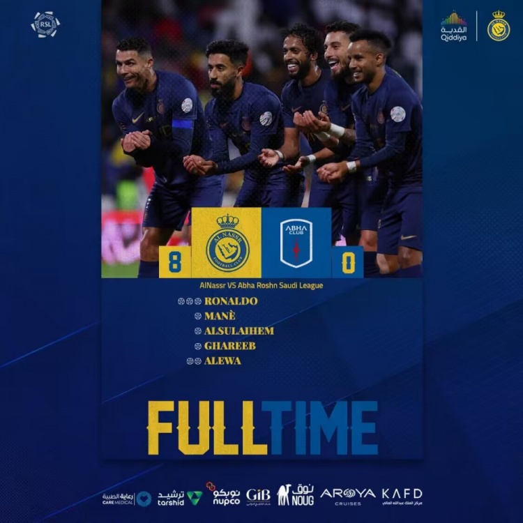沙特联-C罗连场戴帽+独造5球+任意球双响 利雅得胜利8-0艾卜哈