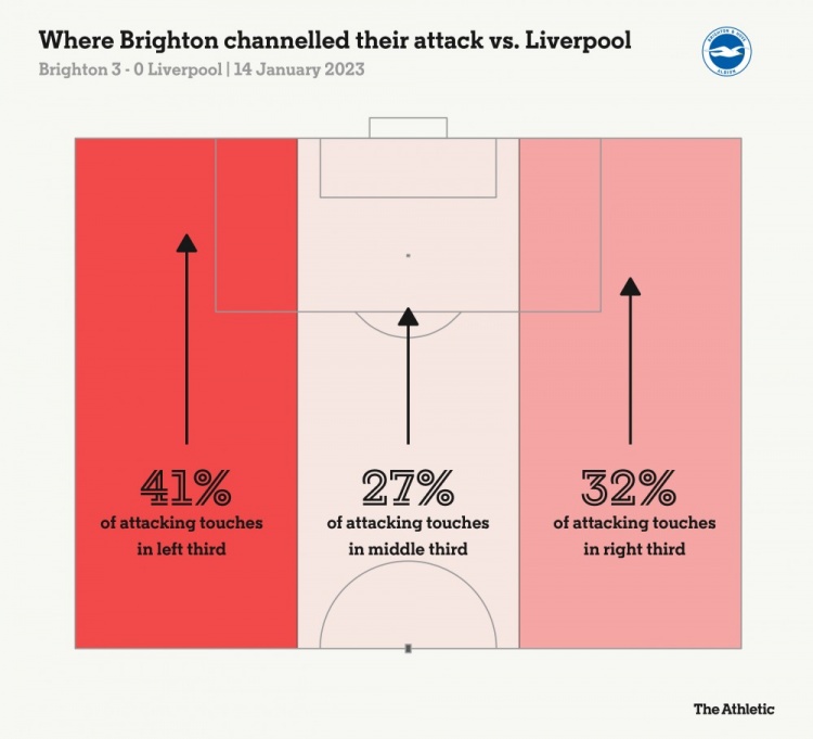 2023年1月利物浦不敌布莱顿之时,布莱顿的左中右三路进攻占比
