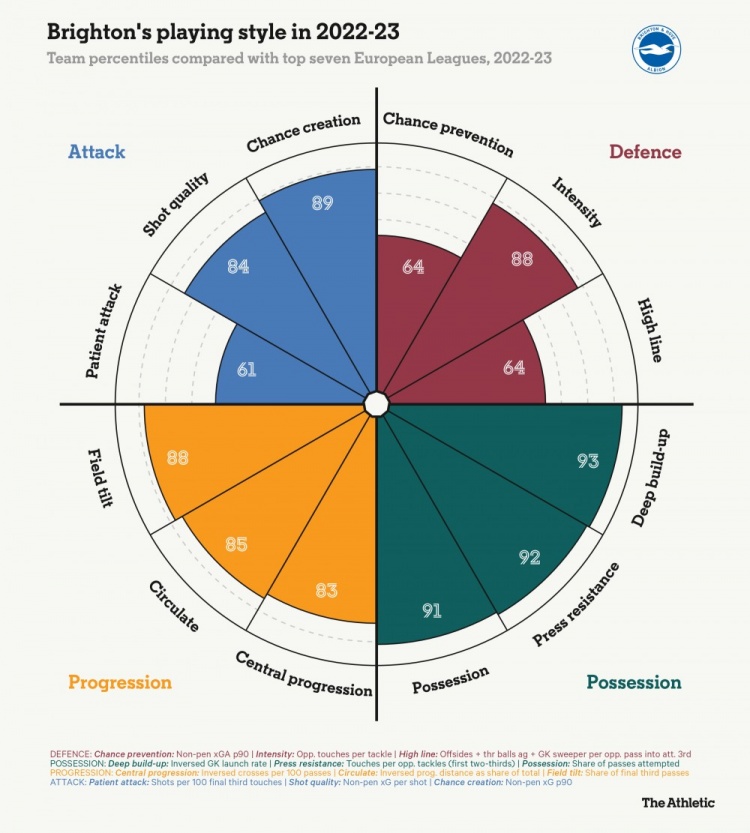 上赛季布莱顿各项数据横向对比欧洲七大联赛球队的百分位数