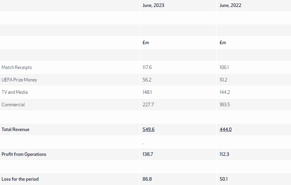 来自赞助、商品销售和第三方活动、旅游景点、会议和活动等其他收入的商业收入,以及季前巡回赛的回归,营收增加到2.277亿英镑(2022年为1.835亿英镑)。