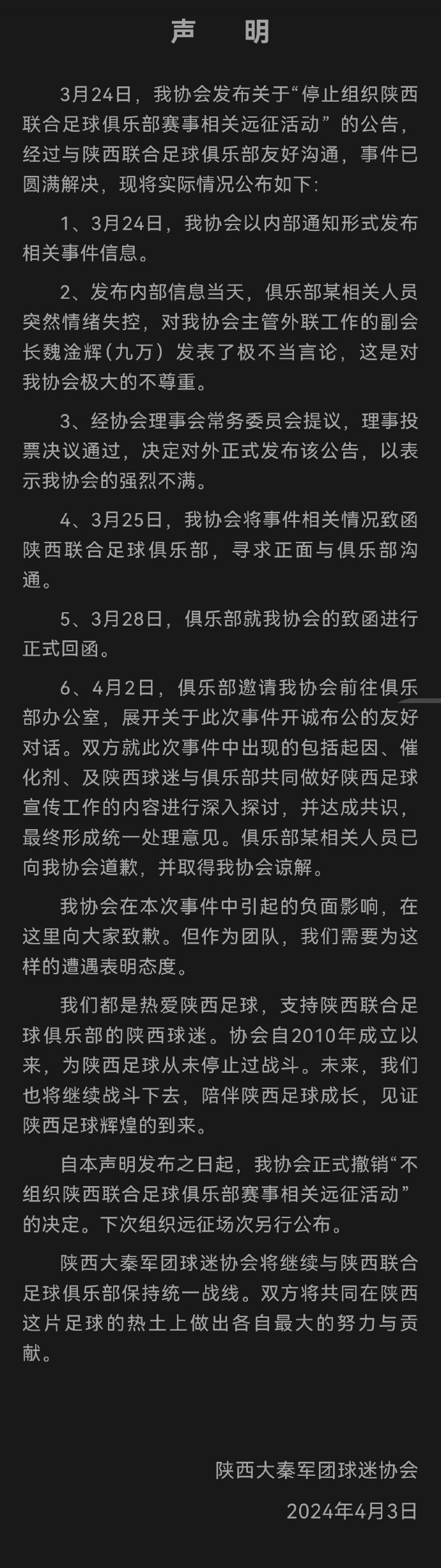 4月3日讯 今天,陕西大秦军团球迷协会发布声明,称和陕西联合俱乐部之间的问题经过沟通已经圆满解决。