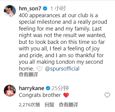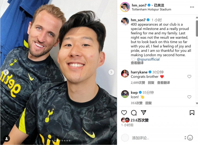 孙兴慜在个人社媒晒出多张照片纪念这一特殊时刻,其中也包括一张昔日同凯恩的合影,孙兴慜社媒写道:“为球队400次出场是特殊的里程碑时刻,对于我和我的家人来说都感到非常自豪。昨晚的结果不是我们想要的,但是回忆起与你们一同度过的这些时光,我感到无比愉快和骄傲,我也十分感谢你们让伦敦成为我的第二故乡。”