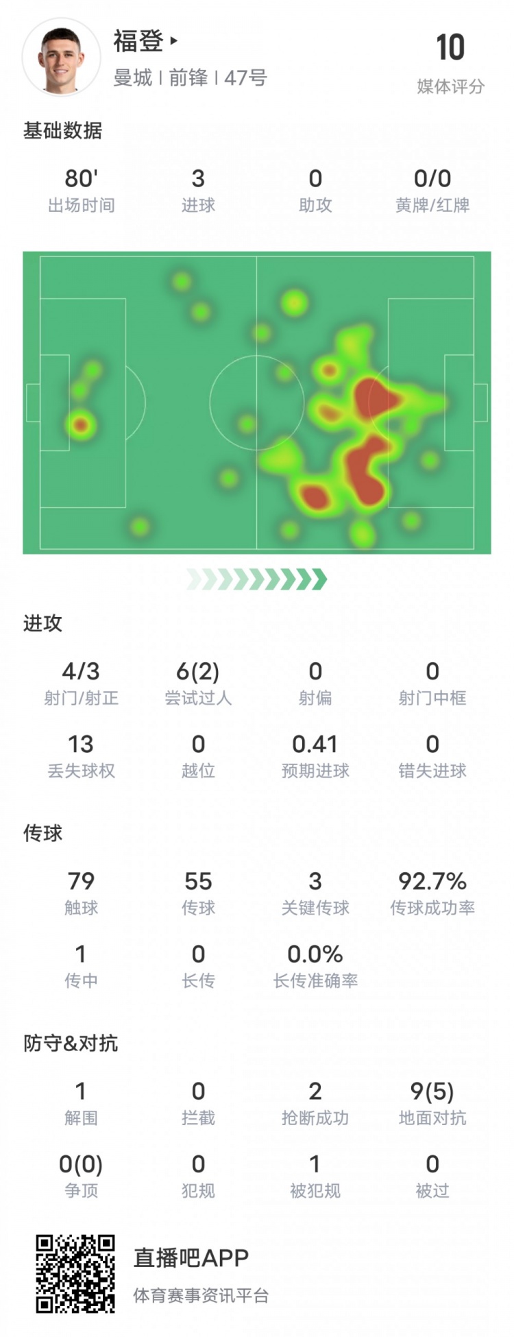 福登本场比赛具体数据如下: