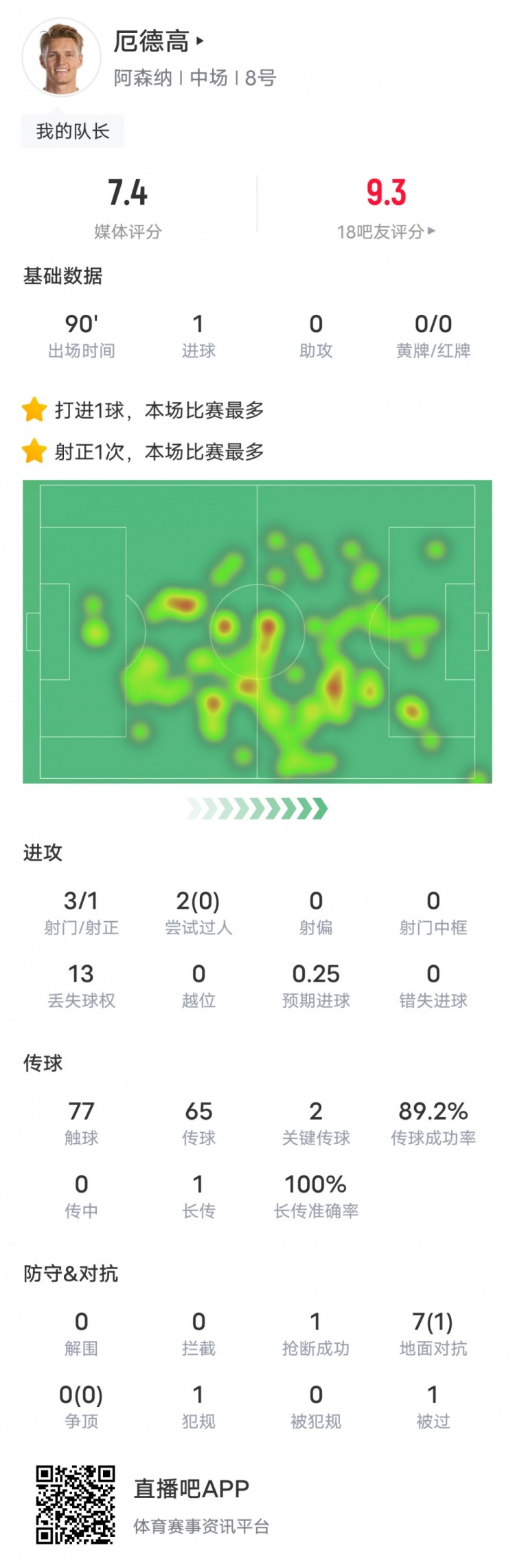4月4日讯 在2-0战胜卢顿的比赛中,阿森纳中场厄德高首发出战,打满全场,贡献1粒进球,送出2次关键传球,评分7.4。