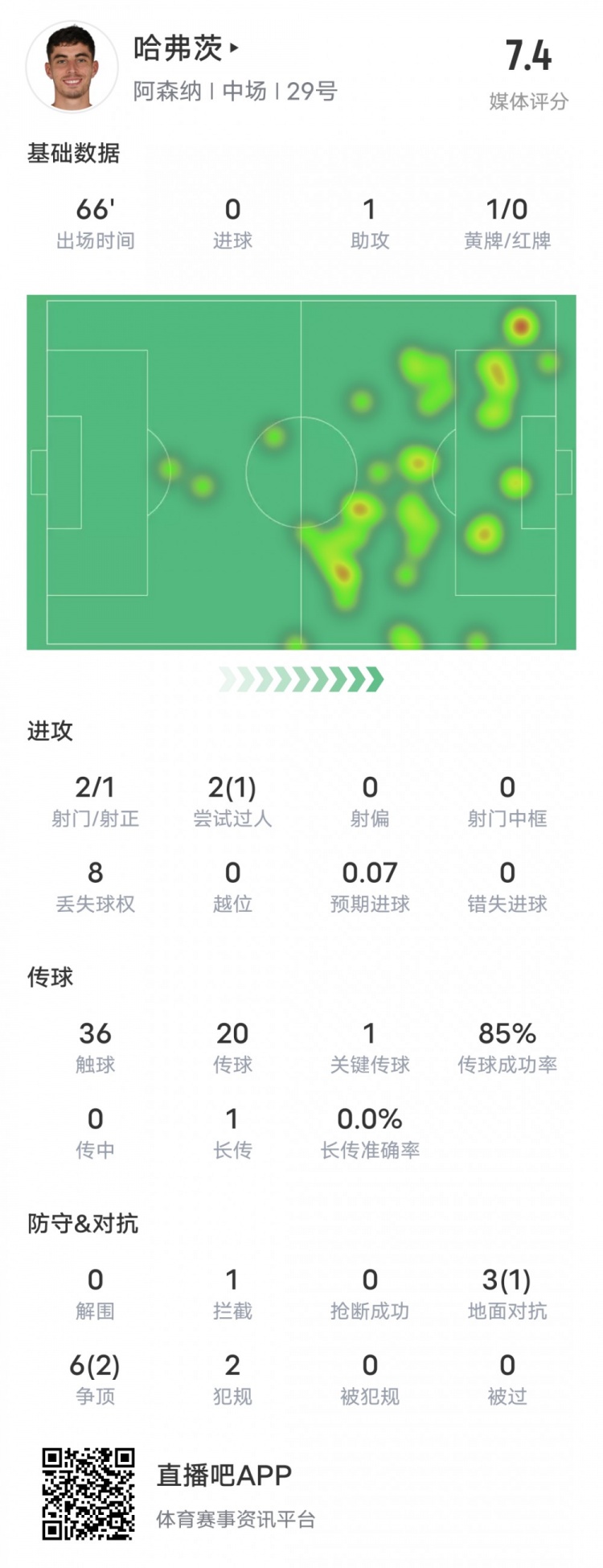 4月4日讯 在对阵卢顿的比赛中,阿森纳攻击手哈弗茨首发出战,贡献1次助攻,送出1次关键传球,还有1次过人成功,评分7.4。