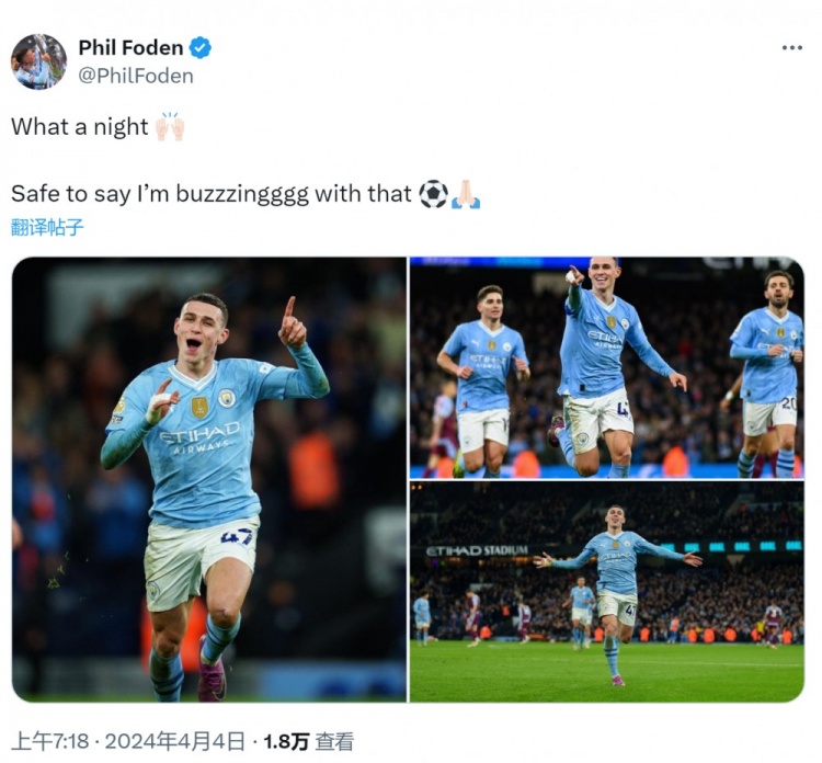 赛后福登在社交媒体上晒出自己庆祝进球的照片,并写道:“多么美妙的夜晚,可以肯定地说,我对此感到很兴奋⚽️