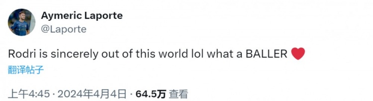 罗德里为曼城出战的近63场比赛保持不败,曾与他在曼城共事的拉波尔特在社交媒体上写道:“罗德里真是太出色了,多么棒的球员!”