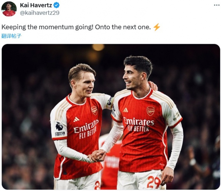 据统计,哈弗茨本赛季英超已经取得8球4助攻,12次参与进球也是其加盟英超以来单赛季最高。赛后哈弗茨也在个人社媒晒出与厄德高合影,配文写道:“让我们延续这样的取胜势头,下一场继续!”