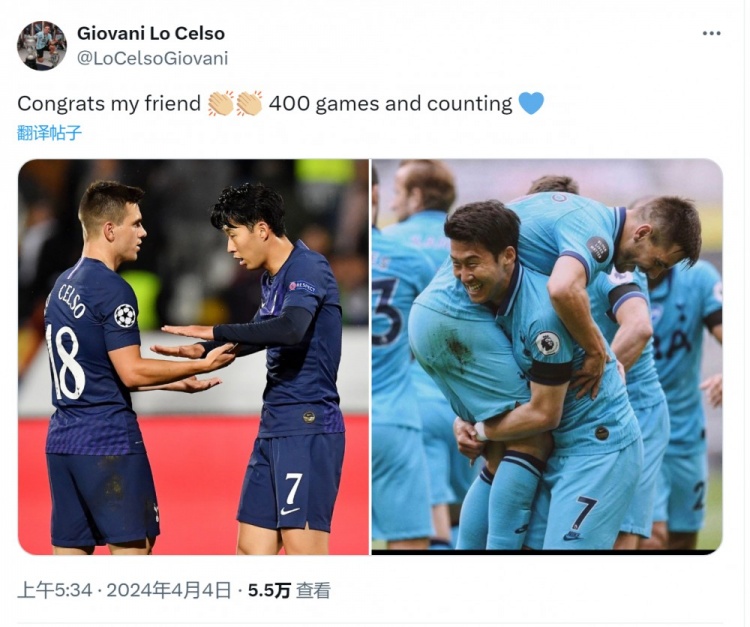 此役是孙兴慜为热刺出战的第400场比赛,热刺中场洛塞尔索社媒晒出与孙兴慜的赛场合照,祝贺他达成这一里程碑。