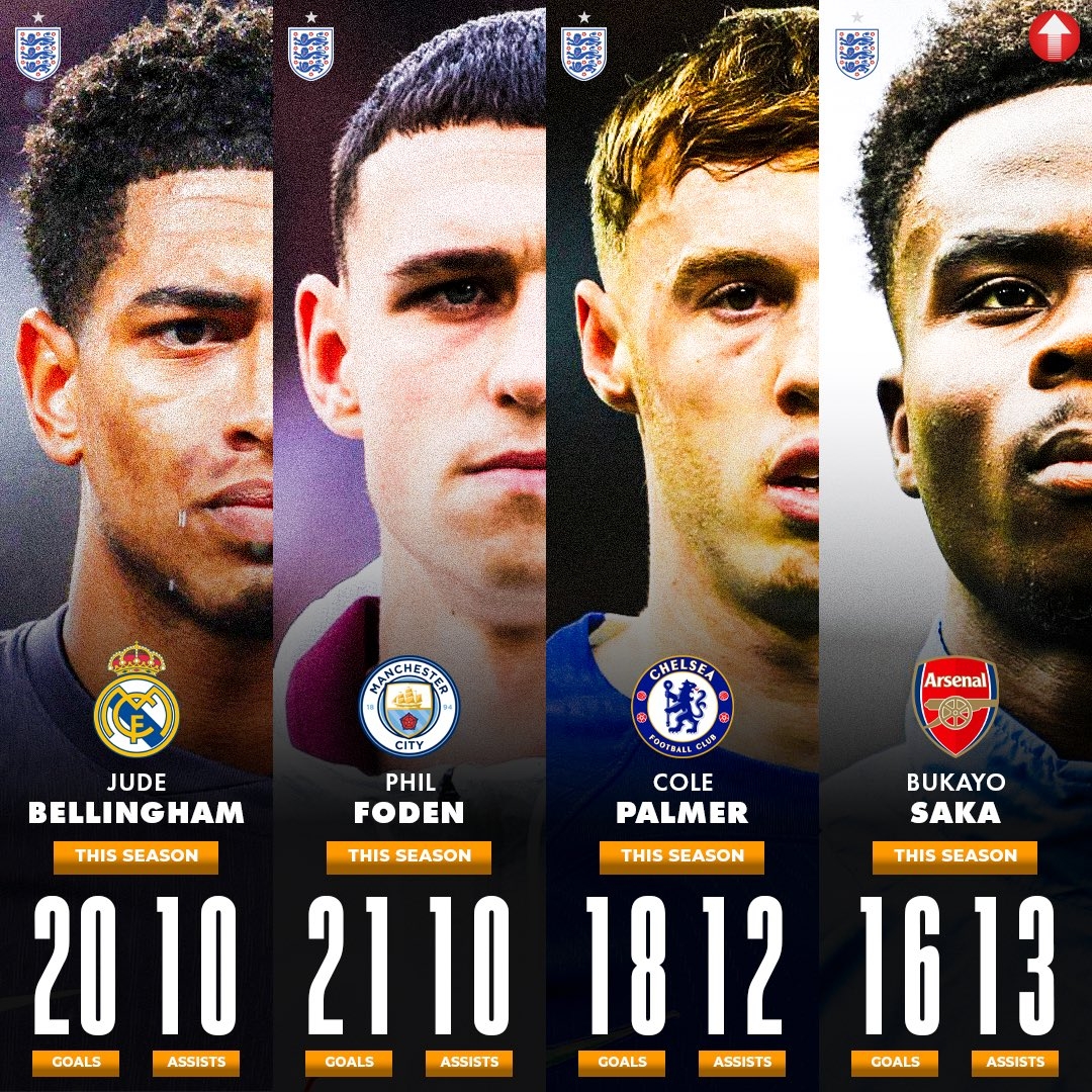 国外博主晒出了英格兰前场4位青年才俊本赛季的数据,每个人都是U23,但每个人进球和助攻都已上双。