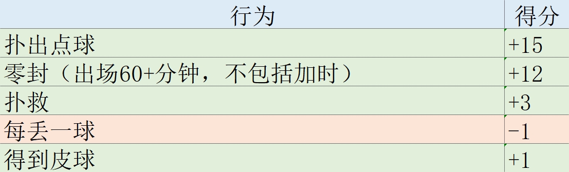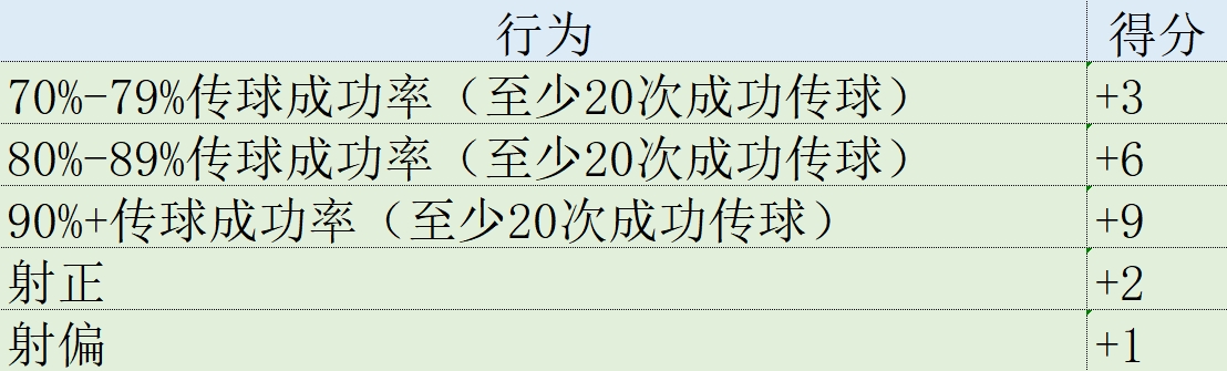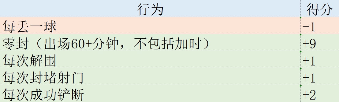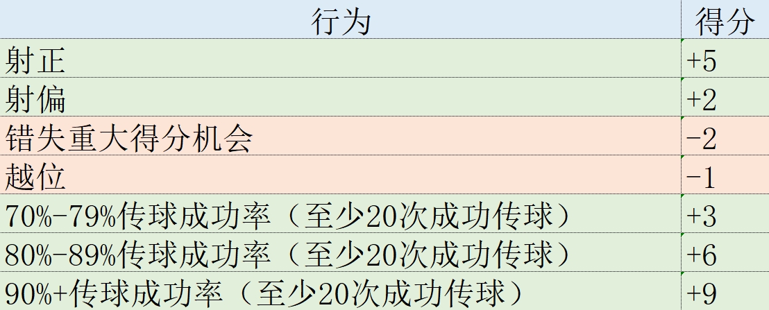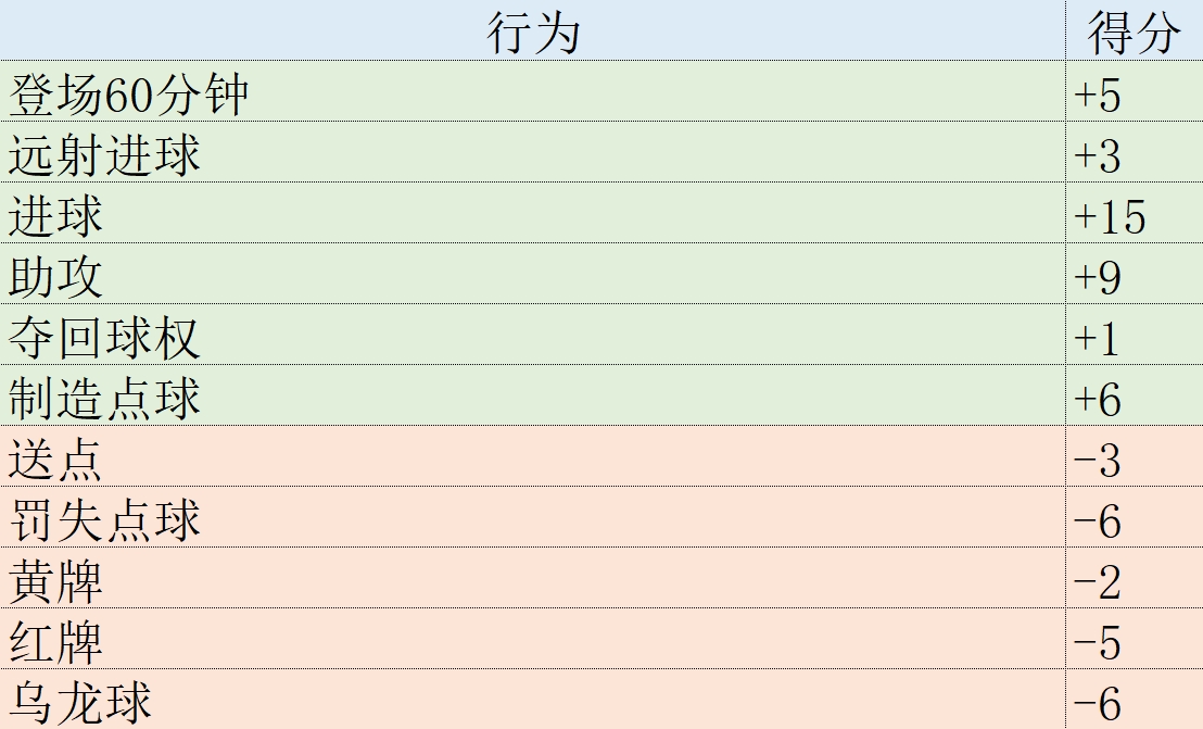 某些场上行为所产生的积分,例如进球、助攻和夺回球权,对所有位置的球员都是相同的。其他数据则取决于每个球员的具体位置。例如,零封、成功铲断和封堵是防守球员的关键数据,而射门和成功传球是中场和前锋的重要指标。