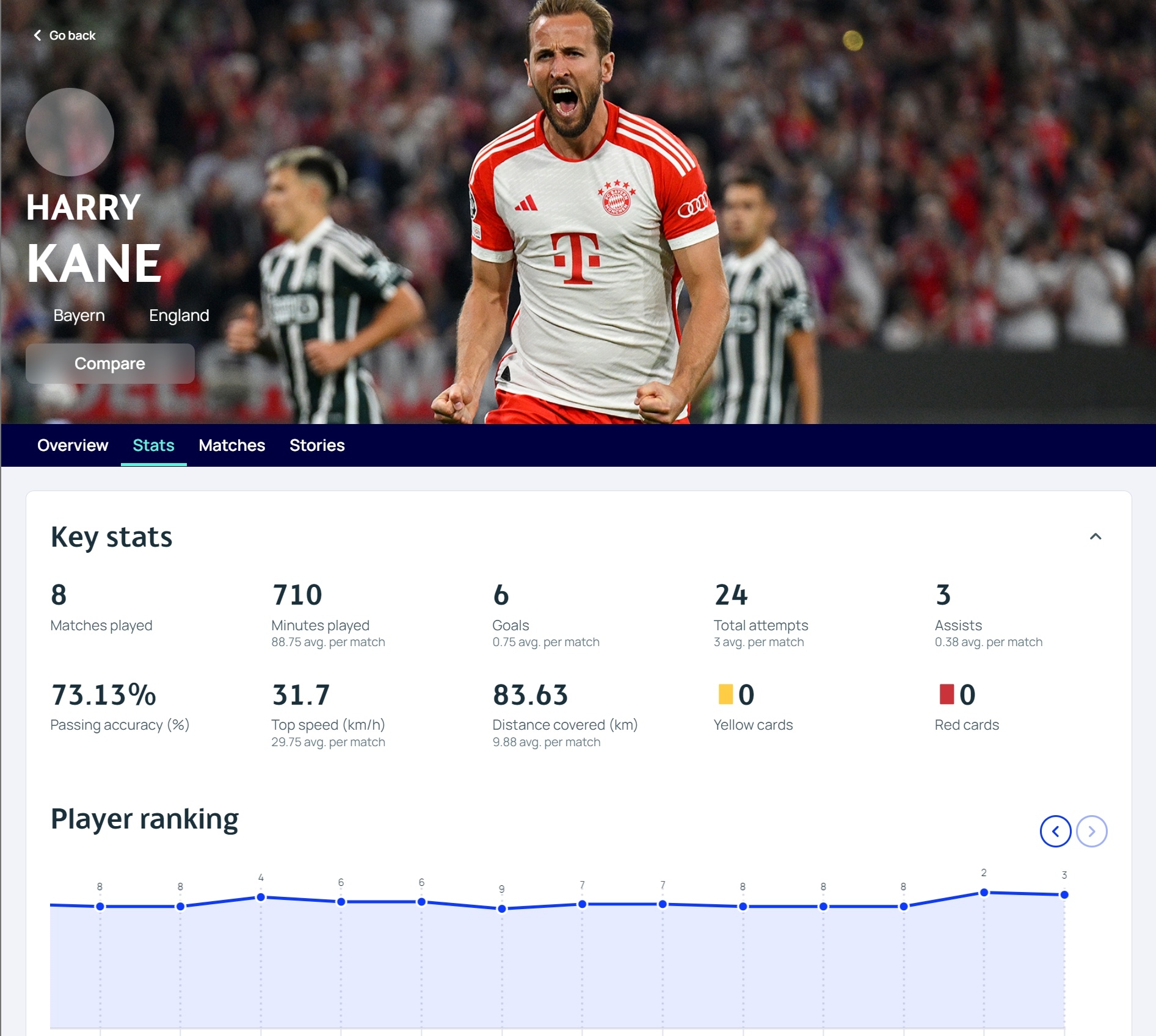 出场时间:710分钟(场均88.75)、射门:24次、传球成功率:73.13%、最高速度31.7km/h、跑动距离:83.63km(场均9.88km)