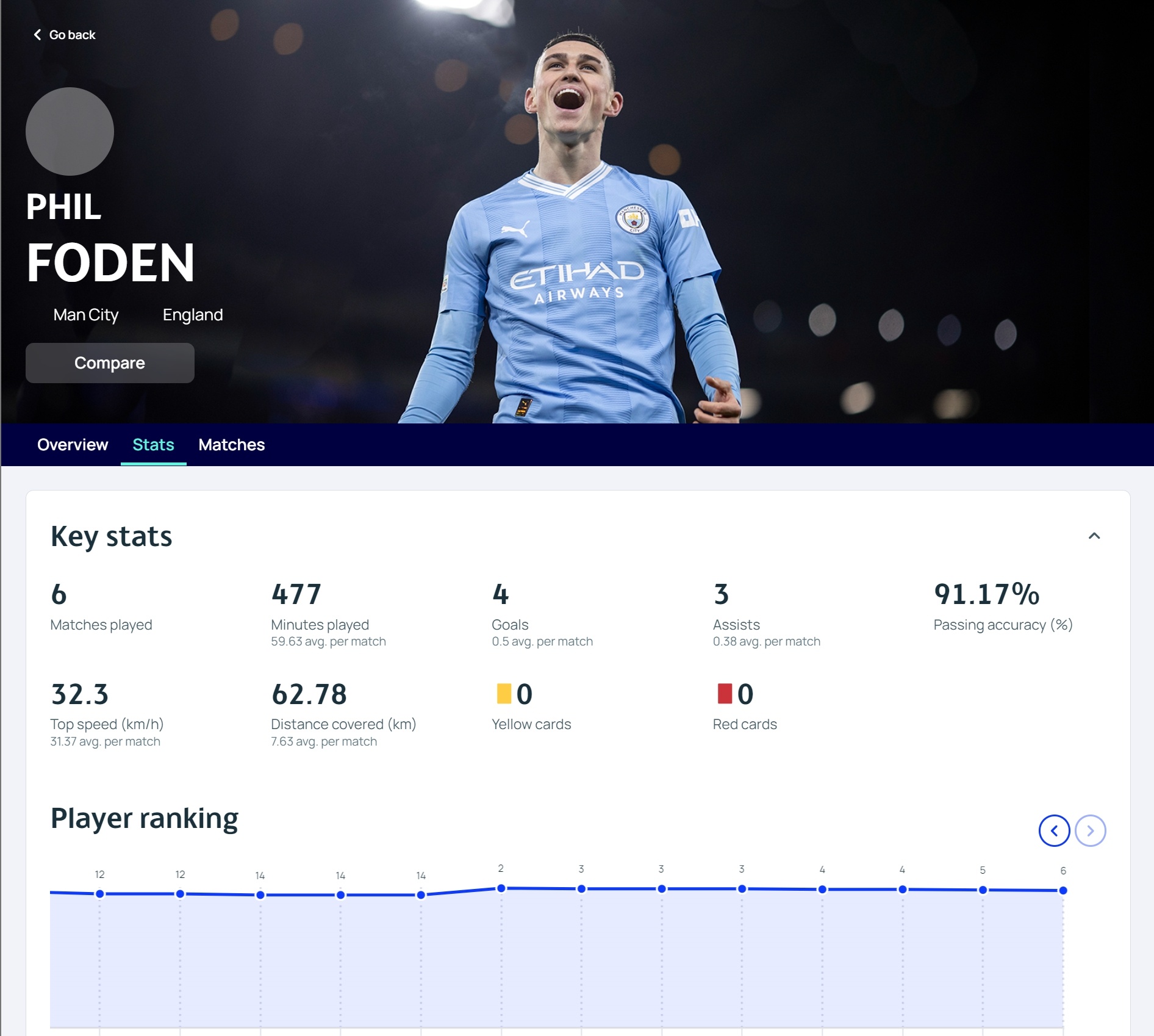 8、中场-福登(曼城)226分/6场4球3助