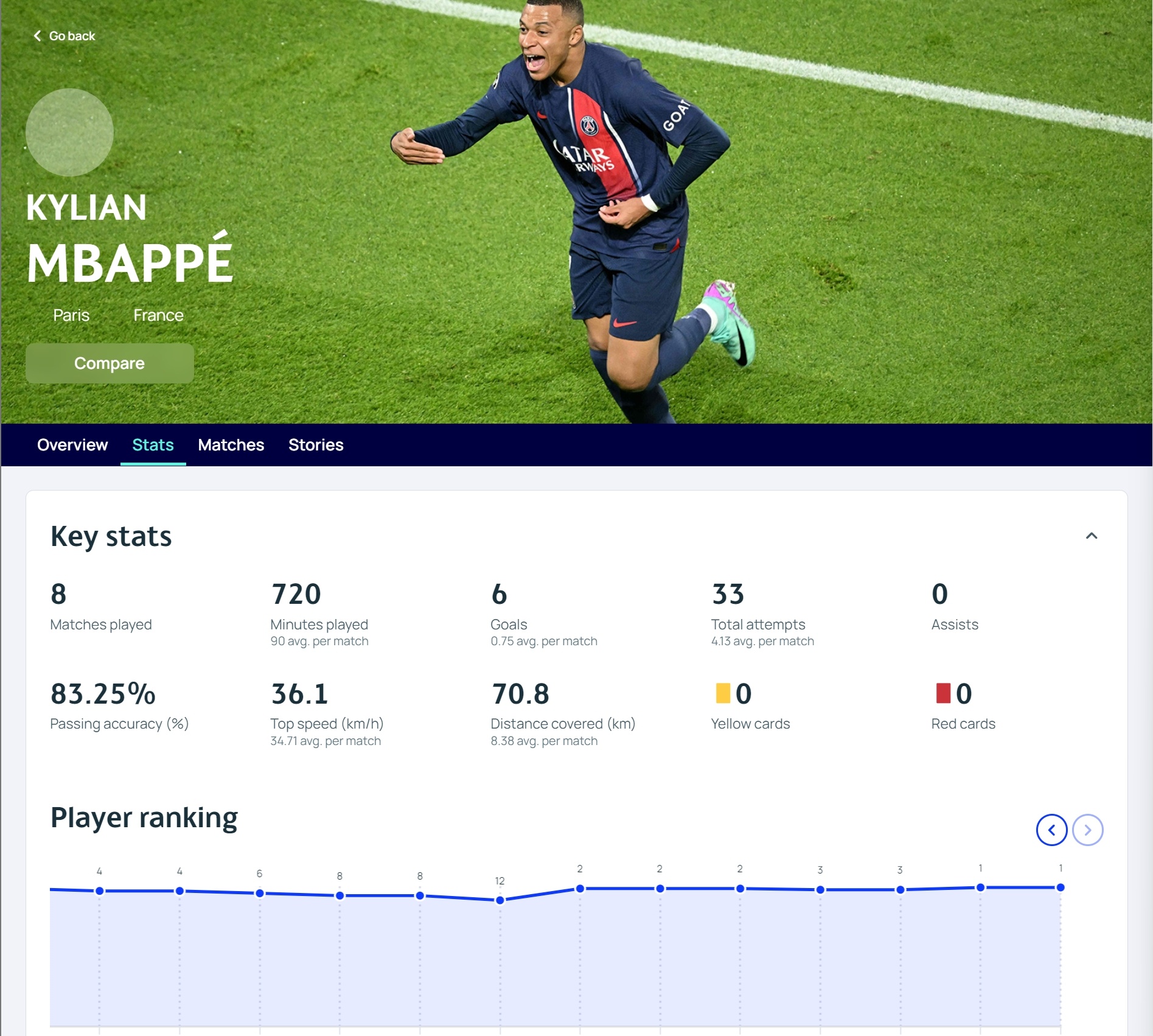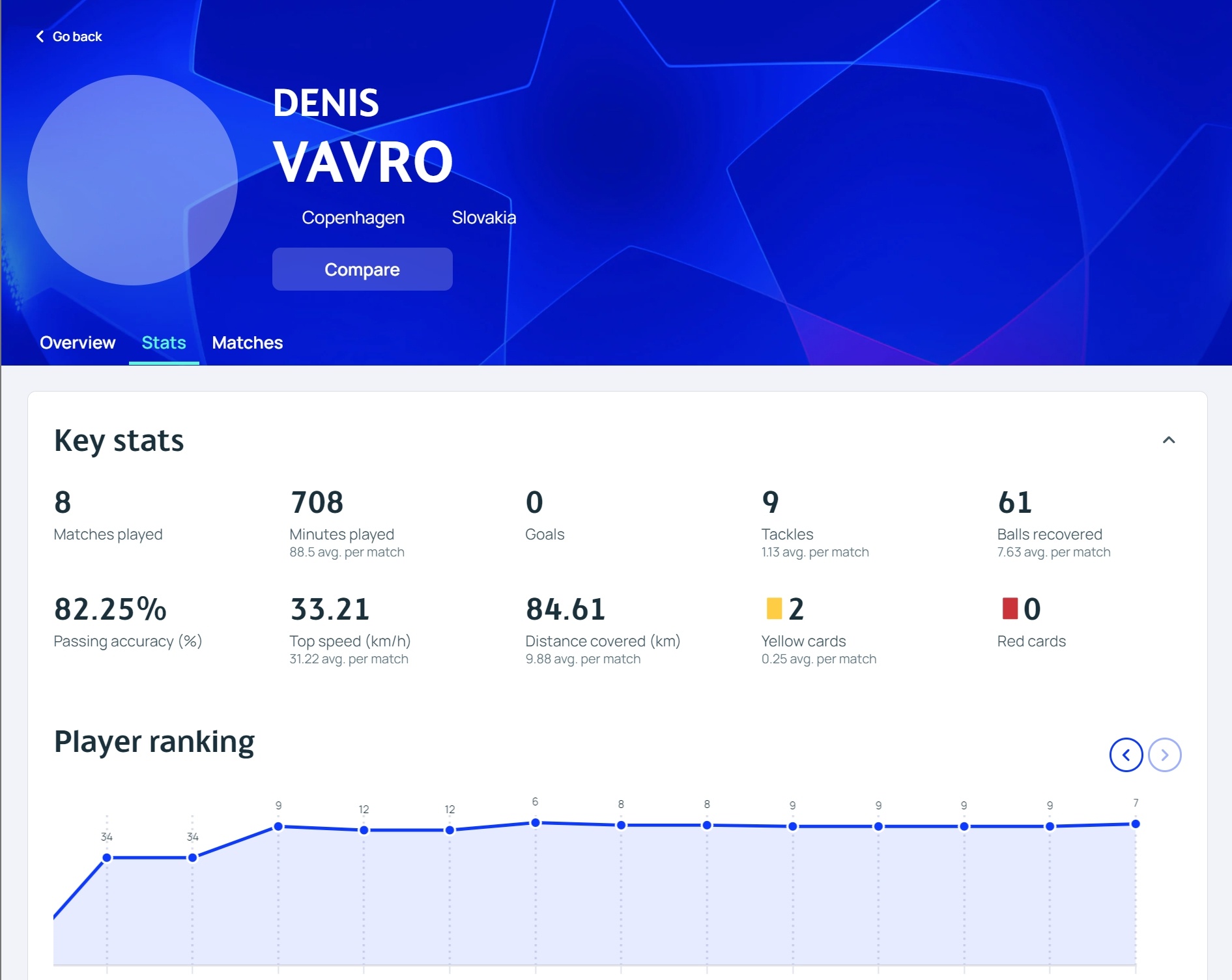 出场时间:720分钟(场均90)、射门:33次、传球成功率:83.25%、最高速度36.1km/h、跑动距离:70.8km(场均8.38km)