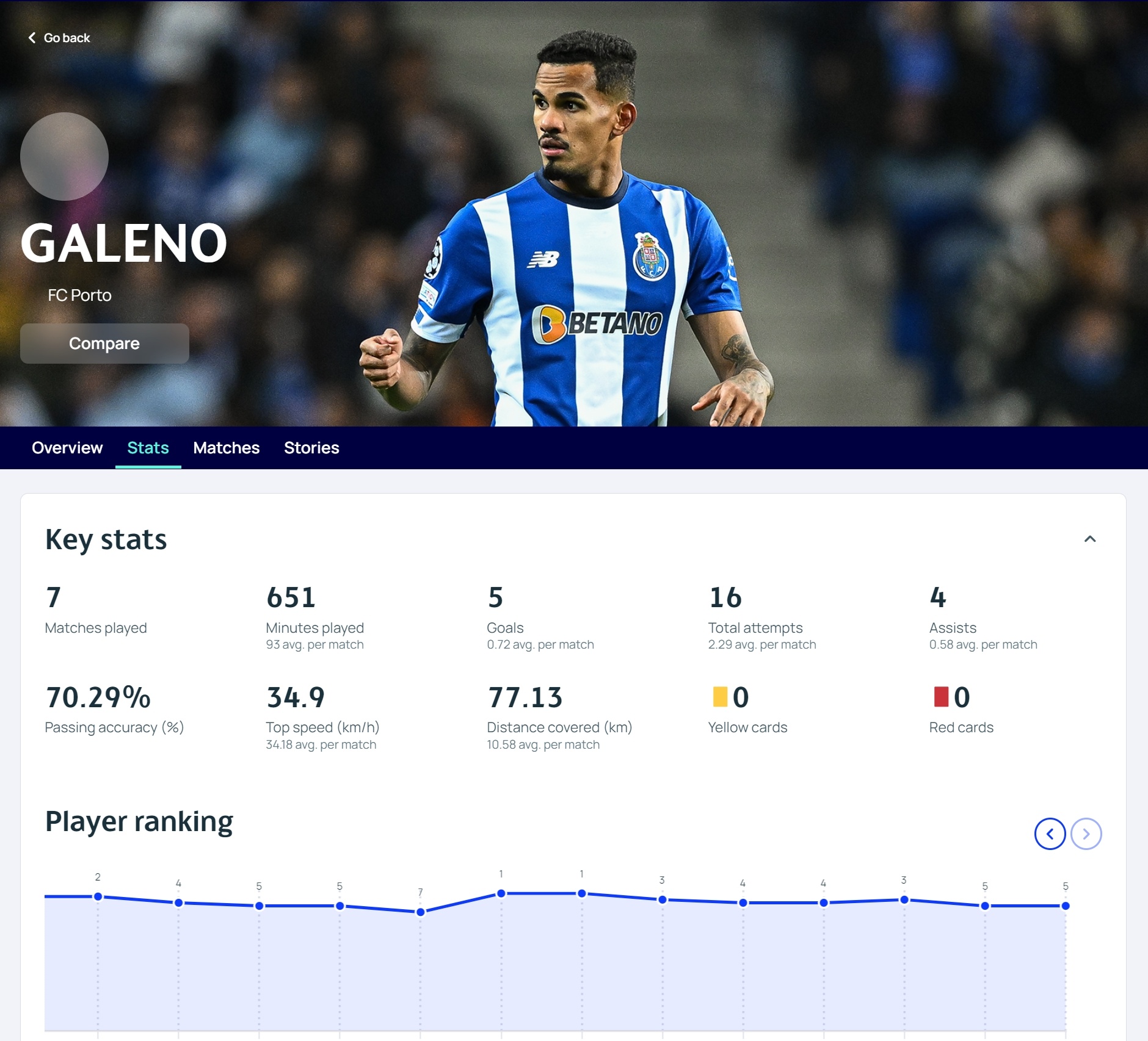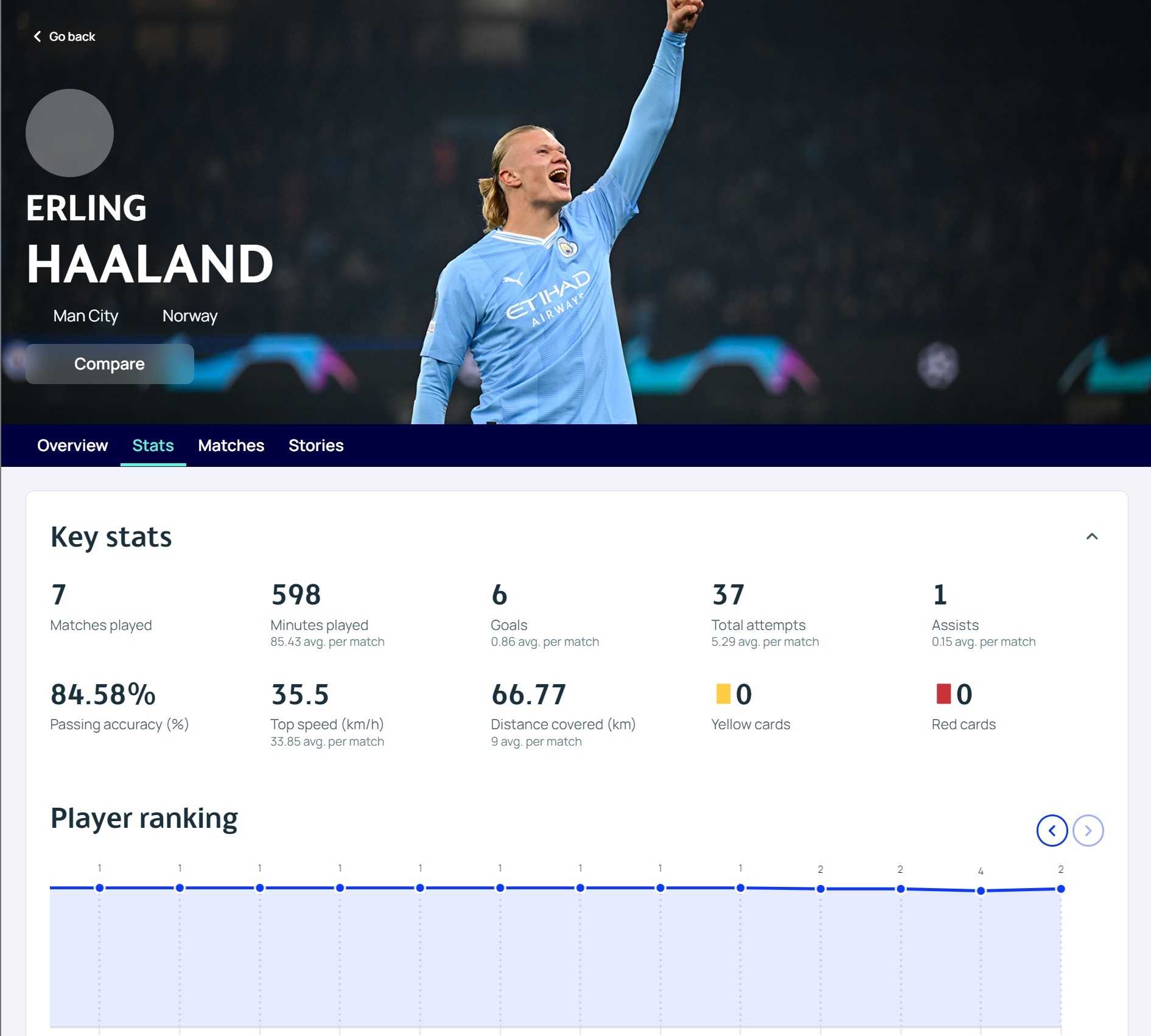 出场时间:651分钟(场均93)、射门:16次、传球成功率:70.29%、最高速度34.9km/h、跑动距离:77.13km(场均10.58km)