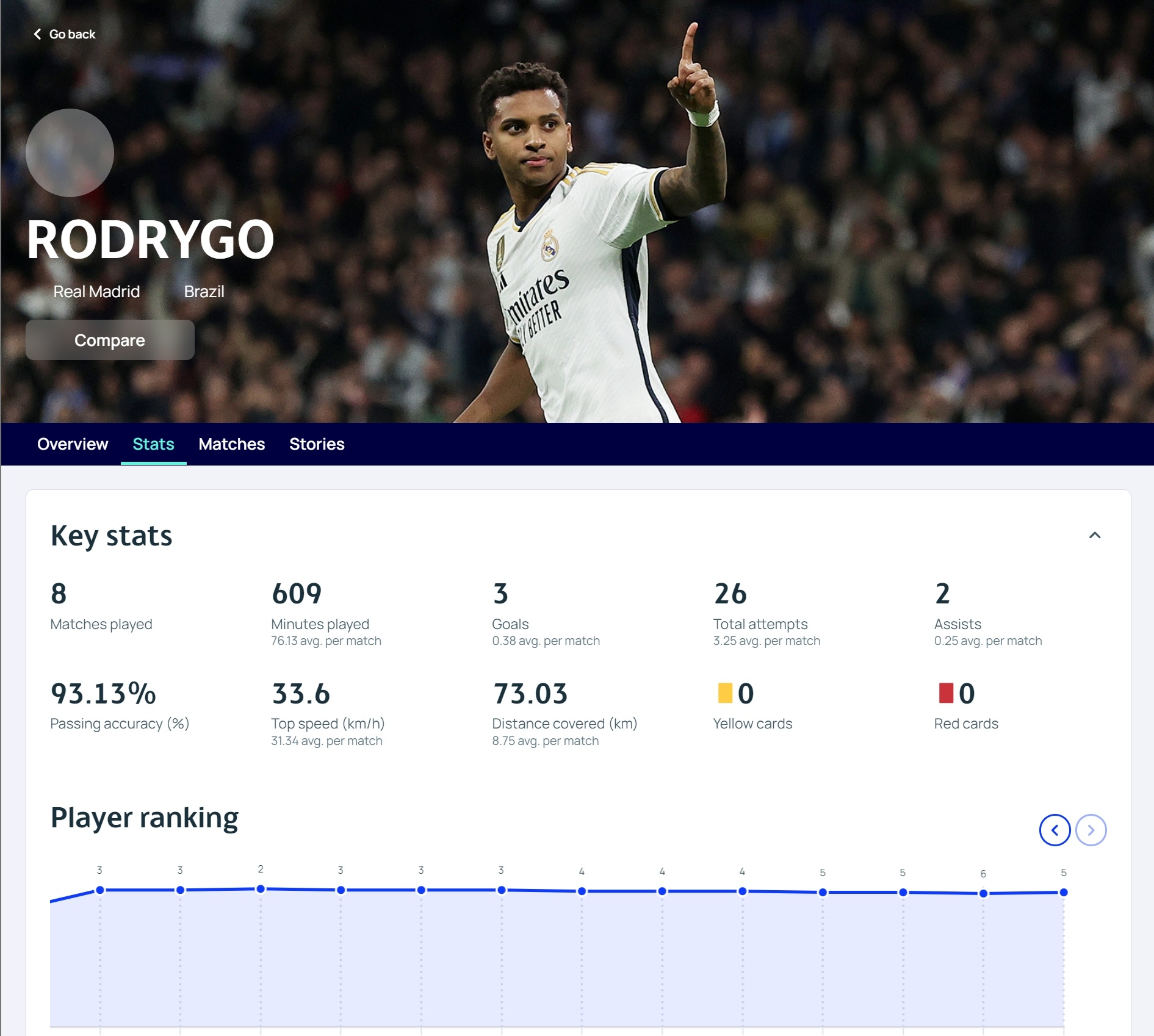 出场时间:609分钟(场均76.13)、射门:26次、传球成功率:93.13%、最高速度33.6km/h、跑动距离:73.03km(场均8.75km)