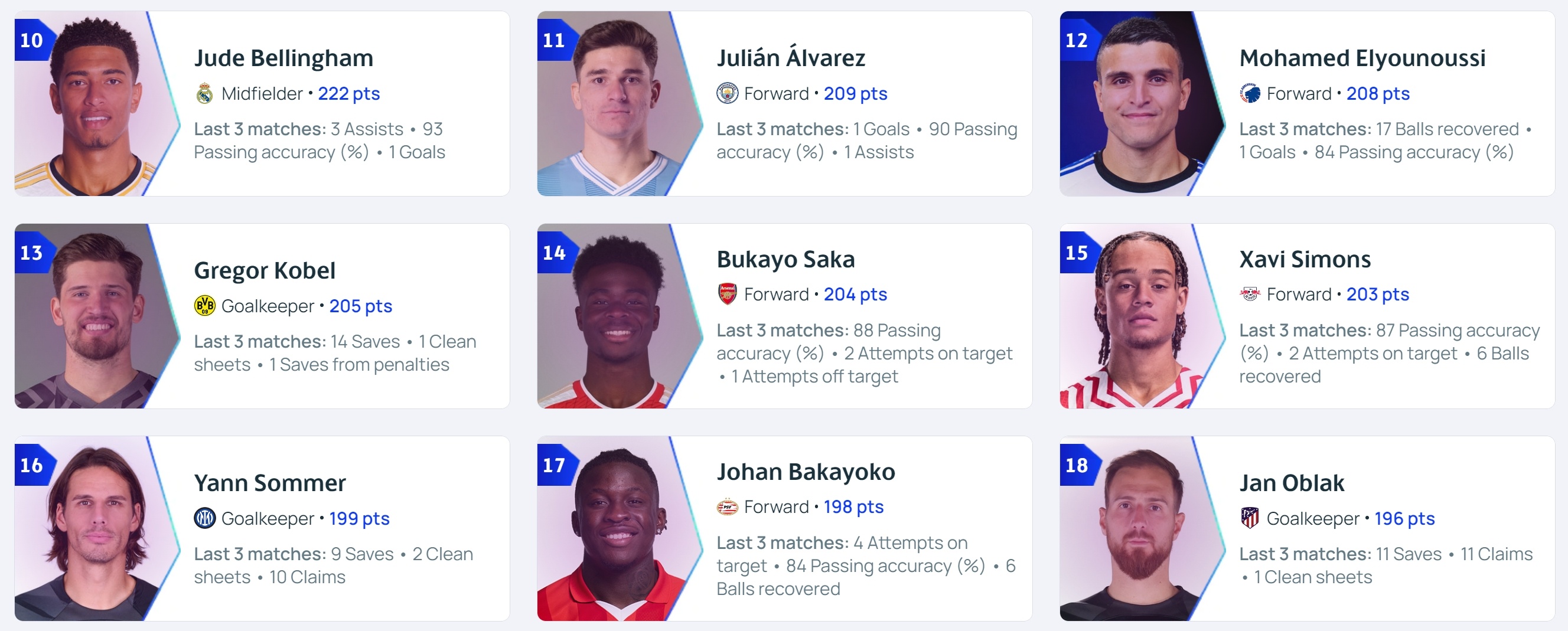 欧足联将跟踪球员在整届赛事中的表现。来自欧洲冠军联赛的比赛数据将被输入到一个专门设计的算法中,根据表现进行排名,并在每个比赛日更新。