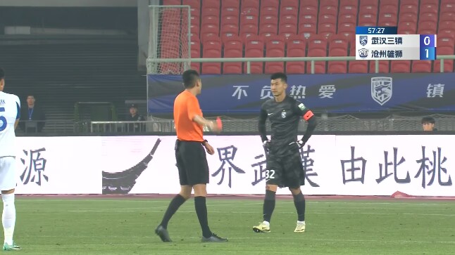 第58分钟,沧州反击,埃韦尔在中线前一点的位置直接一脚吊射,禁区外的三镇门将刘殿座用手将球挡下,主裁向刘殿座出示红牌将他罚下,三镇10人应战。