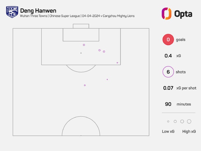 6 - 邓涵文本场比赛完成6次射门,刷新个人单场中超联赛射门次数纪录。