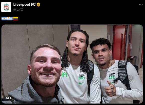 获胜后,利物浦官推晒出了这三名南美球员的赛后合影,并配上了阿根廷、乌拉圭和哥伦比亚国旗的表情。