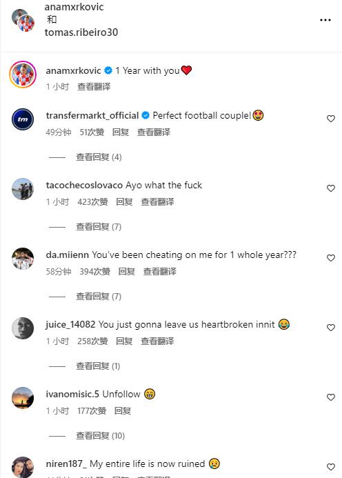马尔科维奇分享与男友的合照:“和你在一起一年了❤️。”评论区不少人送上祝福,也有很多球迷自嘲“你让我们心碎了”、“你居然背着我出轨一年了”。