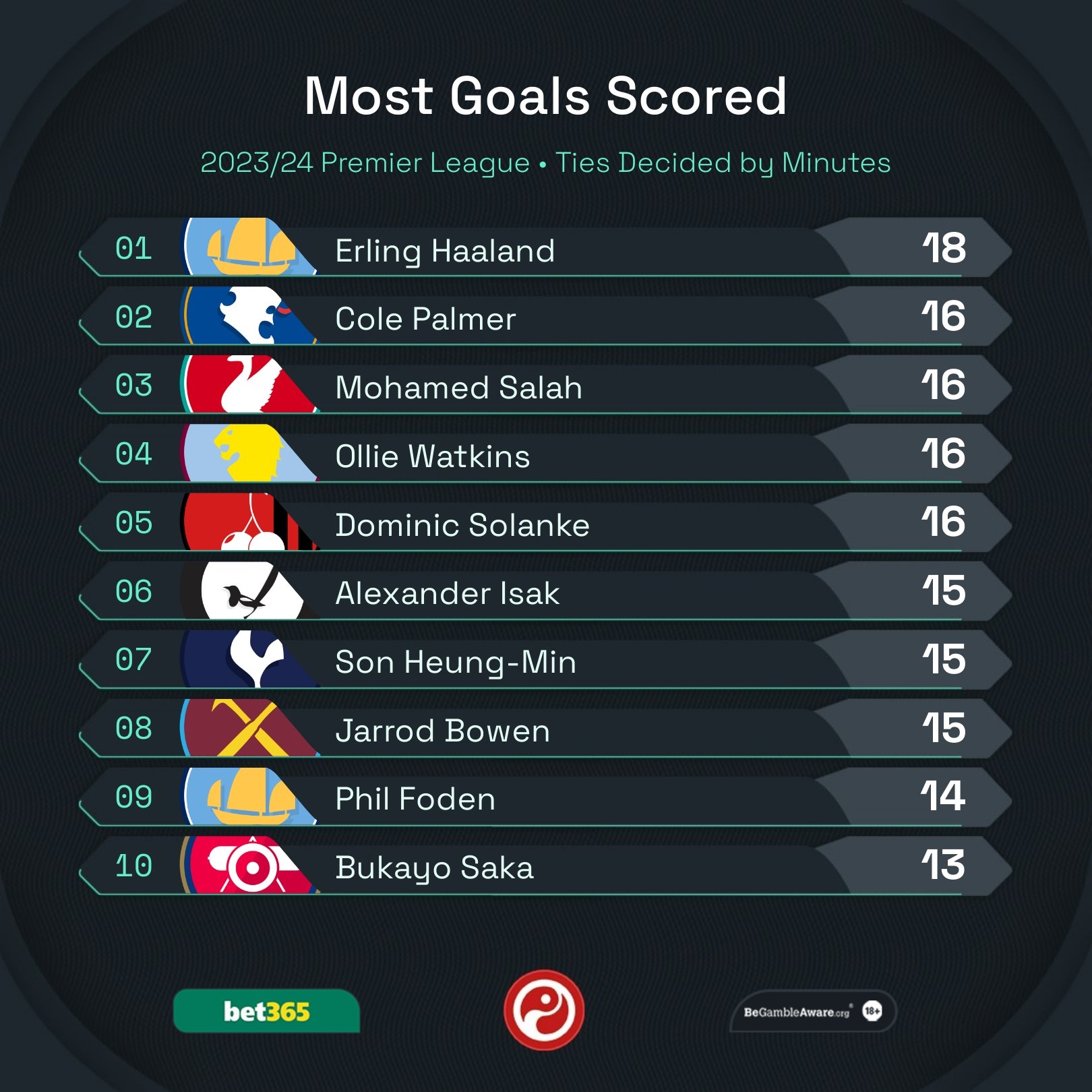 目前在英超射手榜上,哈兰德18球位居榜首,帕尔默与沃特金斯、索兰克、萨拉赫16球并列第二,孙兴慜、伊萨克、鲍恩15球并列第六。