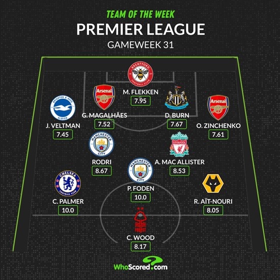 4月5日讯 WhoScored根据球员评分列出了英超第31轮比赛最佳阵容,帕尔默、福登以10分领衔,麦卡利斯特、罗德里、加布里埃尔、津琴科在列。
