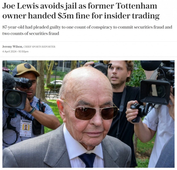 4月5日讯 据电讯报报道,现年87岁的热刺前老板、亿万富翁乔-刘易斯,因非法分享股票内幕,被处以500万美元(约396万英镑)的罚款,免于牢狱之灾。刘易斯的家族拥有热刺俱乐部的大部分股份,
