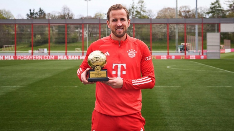 4月5日讯 当地时间周五上午,拜仁官方消息称队内前锋凯恩领取了IFFHS颁发的顶级联赛年度最佳射手奖的奖杯。