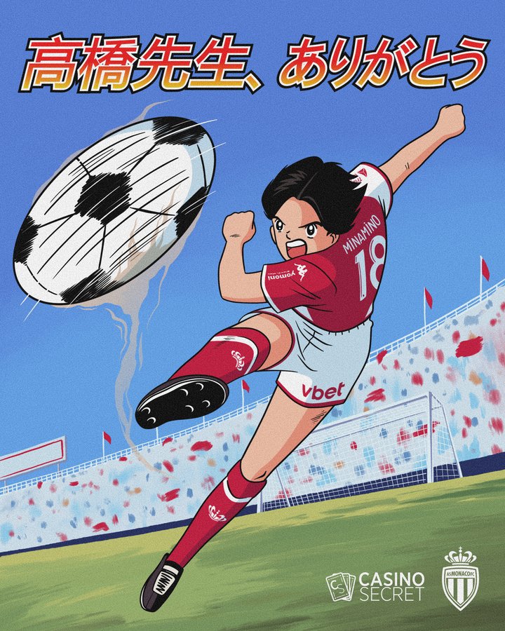 摩纳哥官推晒出了南野拓实足球小将风格海报,并配文写道:“谢谢您,高桥阳一老师!长期连载《足球小将》系列漫画,您辛苦了!”