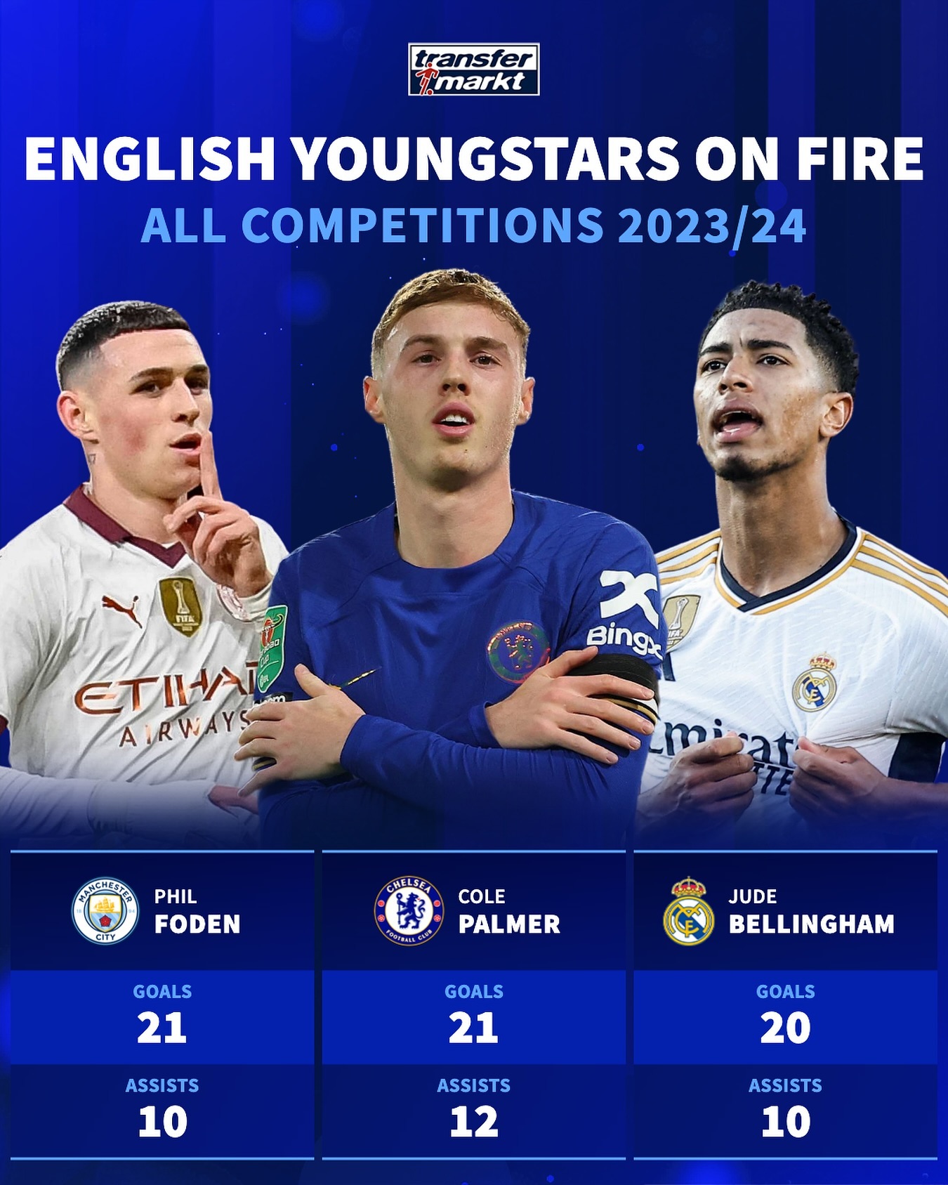 英格兰U23福登、帕尔默、贝林本赛季数据均已达到20+10