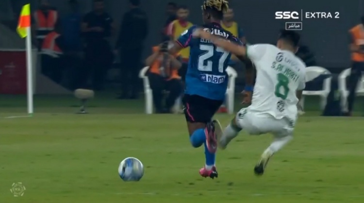 比赛第64分钟,吉达国民球员纳贝特背后双脚离地暴力飞铲豪萨维,主裁判直接出示红牌,但在观看VAR后取消红牌,改判黄牌↓