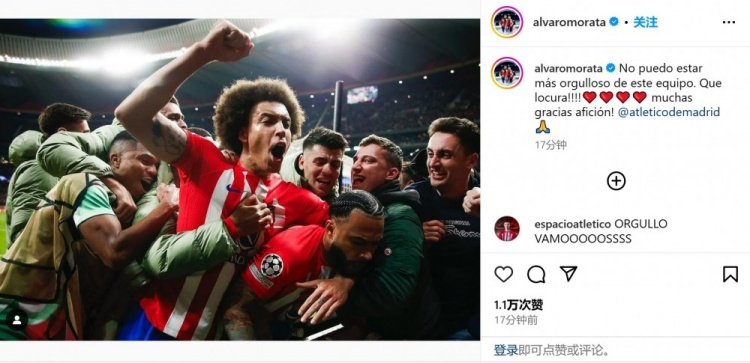 莫拉塔晒出德佩扳平总比分后全队疯狂庆祝的照片,并写道:我为这支球队感到无比的自豪。太疯狂了!!!!❤❤❤❤球迷们,非常感谢你们!