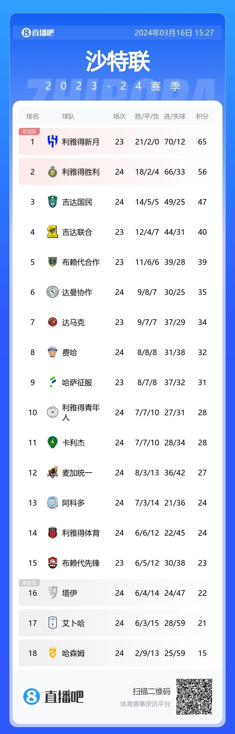 吉达联合目前12胜4平7负积40分,排名联赛第四,落后榜首的利雅得新月25分;哈萨征服积31分,排名联赛第九。