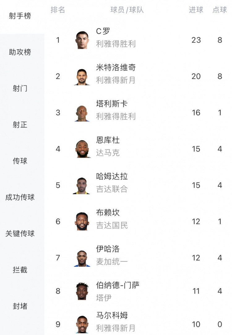 联赛射手榜方面,吉达联合的哈姆达拉已打入15球,并列排名射手榜第四,本泽马打进9球。效力哈萨征服的特略,目前也已经有7球入账。