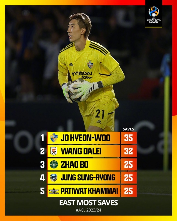 榜单第三位到第五位的三名门将扑救次数相同,都为25次,其中包括了浙江队的赵博,以及韩国门将郑成龙和泰国门将巴提瓦。由于所在球队已经出局,王大雷和赵博都已无法继续刷新在亚冠联赛的扑救数据。
