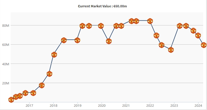 上个赛季,拉什福德在世界杯之后的下半赛季表现极为亮眼,身价一度暴涨2500万欧,从5500万欧涨至8000万欧。