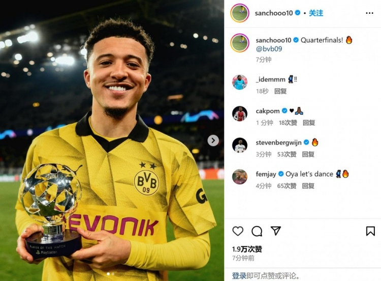 桑乔晒出全场最佳的奖杯,并写道:晋级1/4决赛!