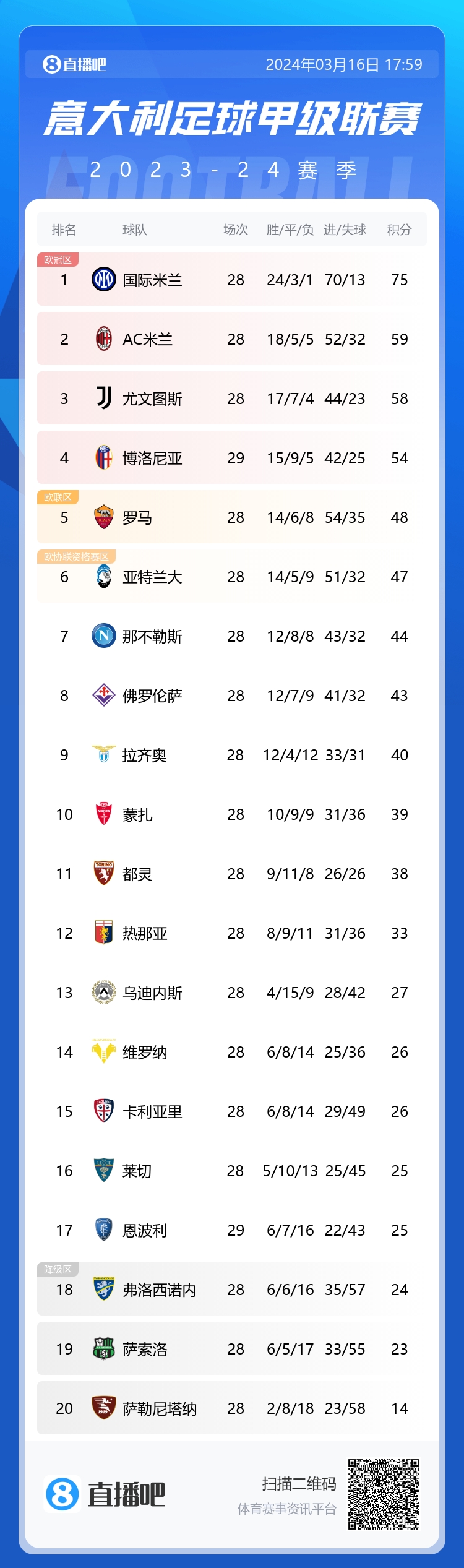 03月16日讯 意甲第29轮,凭借法比安第94分钟的补时绝杀,博洛尼亚1-0战胜恩波利,先赛领先罗马6分,继续排名意甲第4。