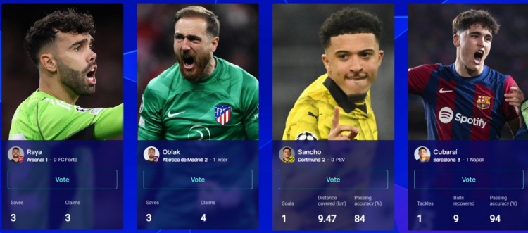 3月14日讯 本周欧冠1/8决赛次回合结束4场争夺,欧冠官方也评选出本周4位最佳球员候选,以下为具体情况: