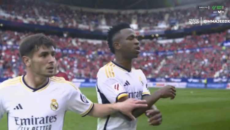 3月17日讯 皇马在西甲第29轮客场4-2击败奥萨苏纳,比赛中维尼修斯因被犯规后不满,抱怨裁判判罚被出示黄牌。