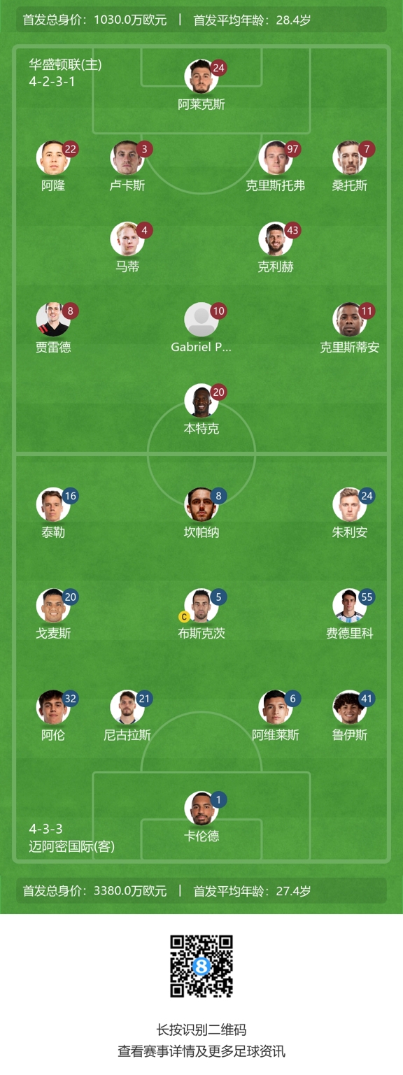 迈阿密国际首发:1-卡伦德、21-弗莱雷、6-阿维莱斯、32-阿伦、41-鲁伊斯、20-戈麦斯、5-布斯克茨、55-小雷东多、16-泰勒、24-格雷塞尔、8-坎帕纳