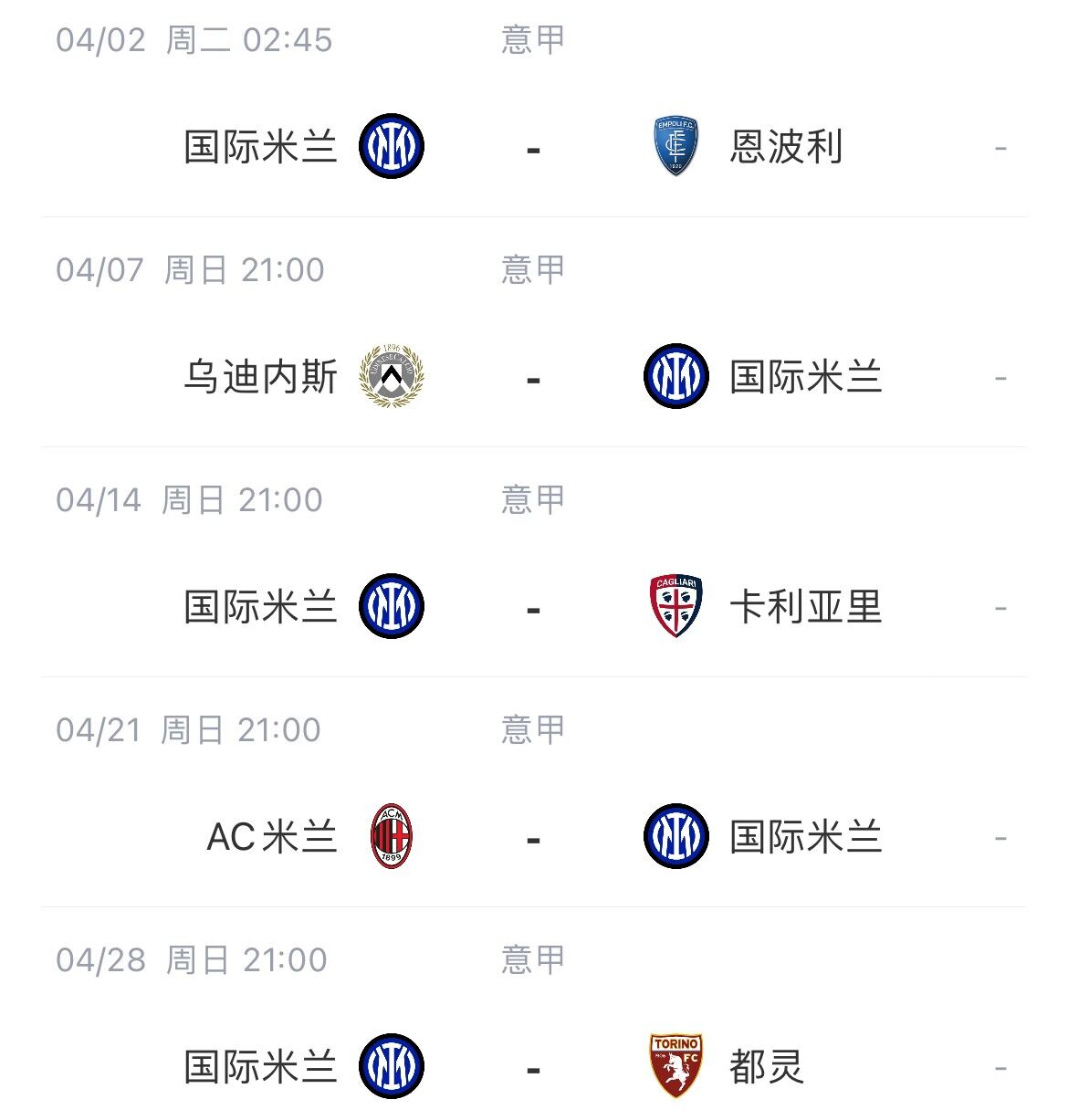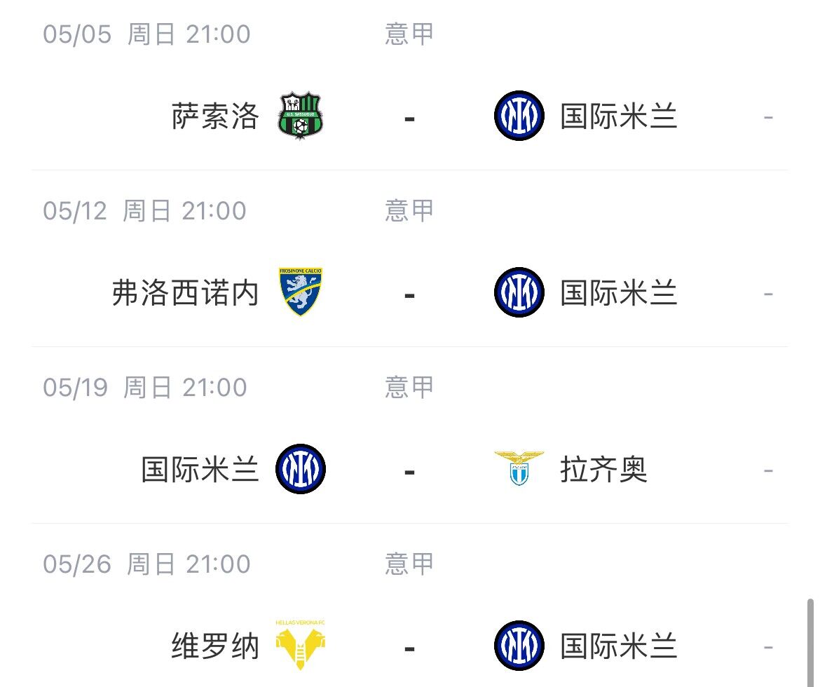 国米剩余赛程: