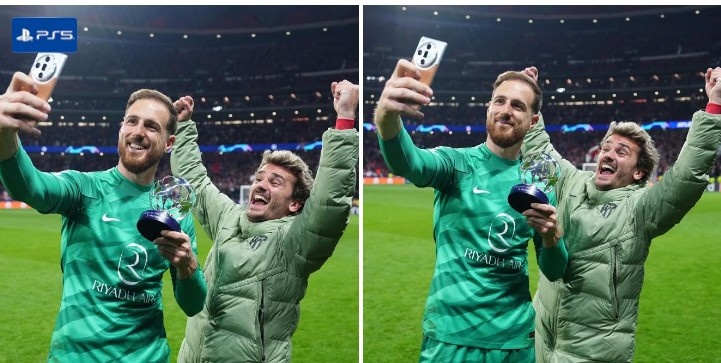 赛后奥布拉克手拿全场最佳球员的奖杯进行自拍,结果格列兹曼搞怪乱入。