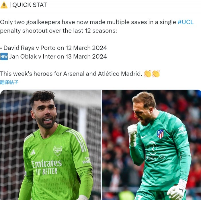 3月14日讯 据Sofascore统计,在欧冠赛场上,过去12个赛季只有两名门将在单次点球大战上扑出超过1次点球,分别是阿森纳门将拉亚和马竞门将奥布拉克。