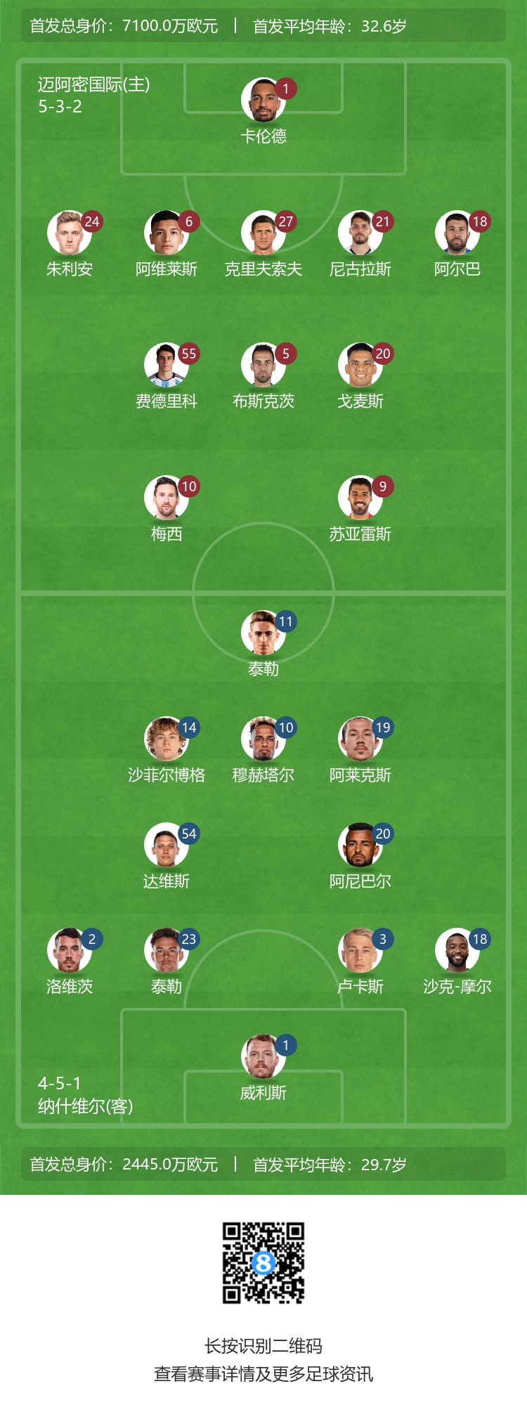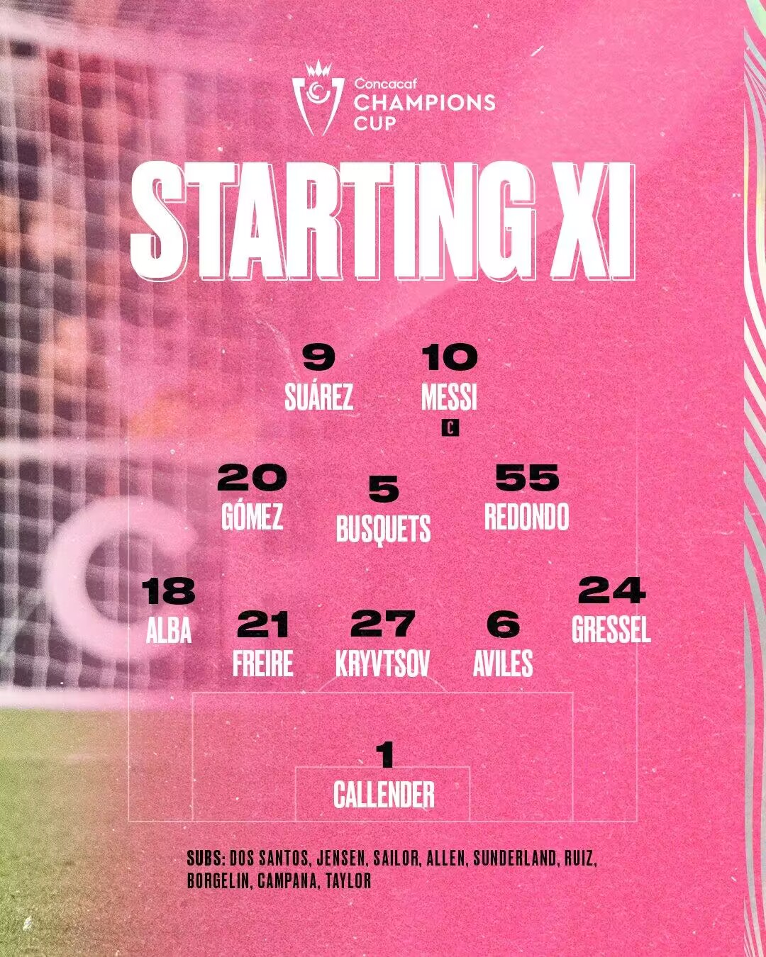 迈阿密国际首发:1-卡伦德、6-阿维莱斯、27-克里夫索夫、21-弗莱雷、18-阿尔巴、24-格雷塞尔、55-小雷东多、5-布斯克茨、20-迭戈-戈麦斯、10-梅西、9-苏亚雷斯