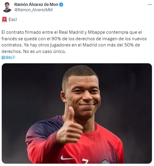 03月17日讯 西班牙名记Ramón Álvarez de Mon消息,在姆巴佩与皇马的合同中规定,姆巴佩将保留90%的肖像权。