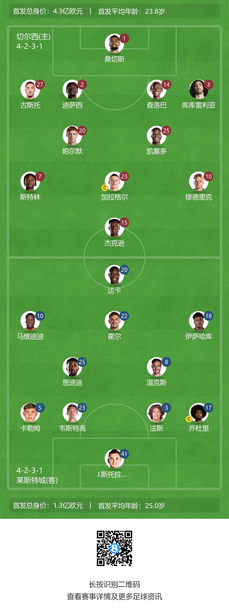 切尔西首发:1-罗伯特-桑切斯、27-古斯托、2-迪萨西、14-查洛巴、3-库库雷利亚、25-凯塞多、23-加拉格尔、20-帕尔默、10-穆德里克、7-斯特林、15-尼古拉斯-杰克逊
