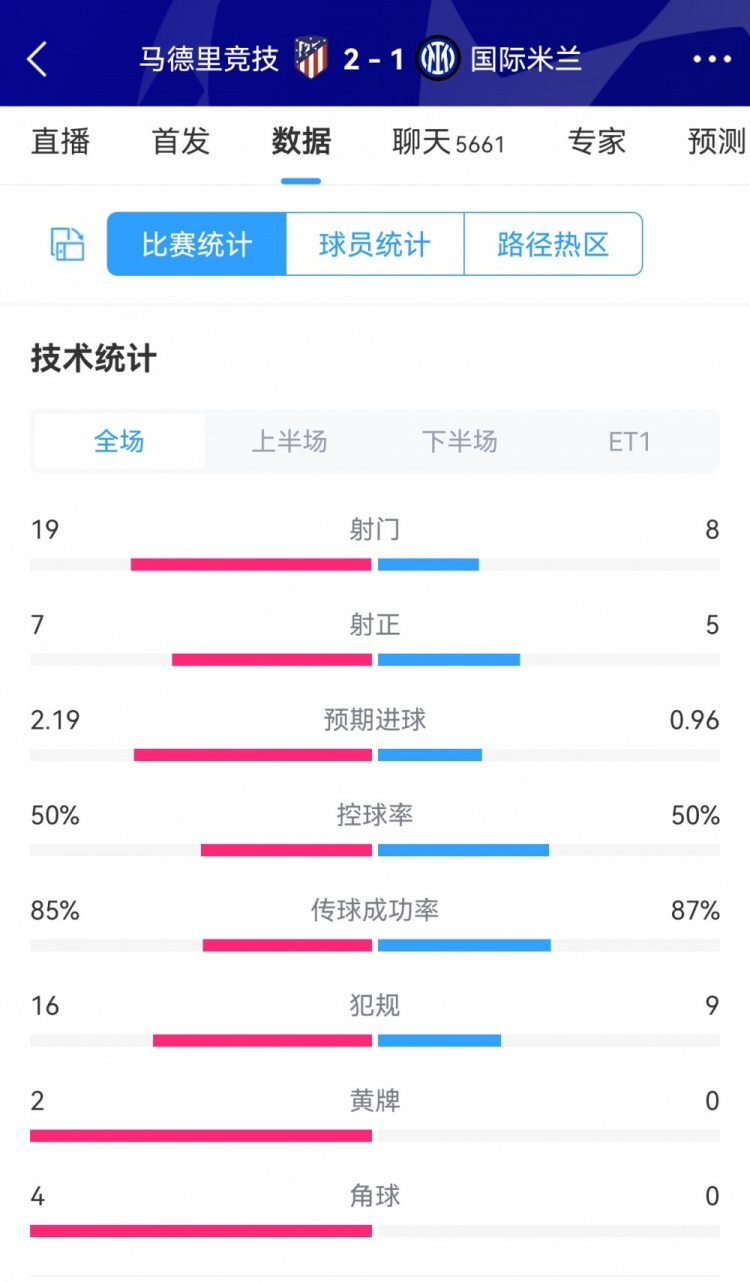 3月14日讯 欧冠1/8决赛次回合,马竞主场2-1、总比分2-2国米进入加时赛,双方90分钟常规时间数据对比如下↓